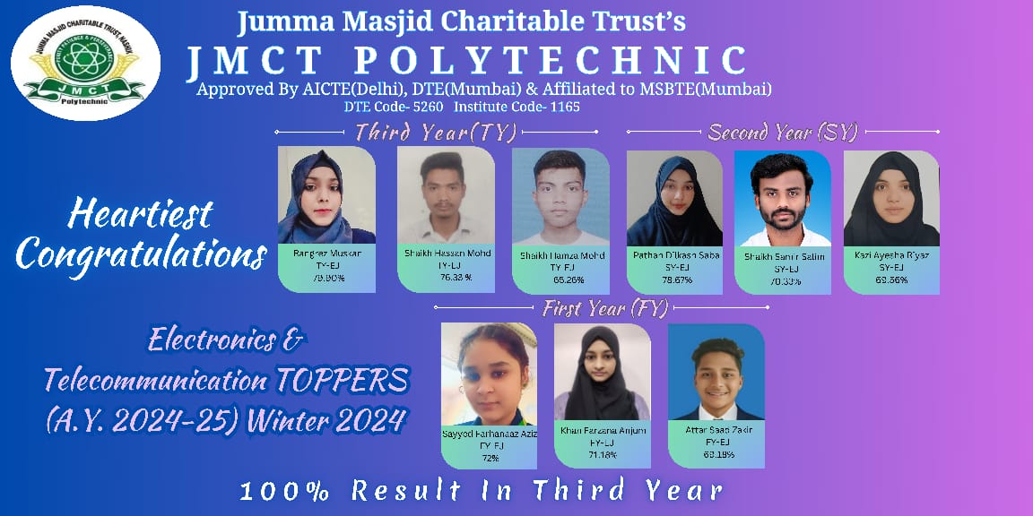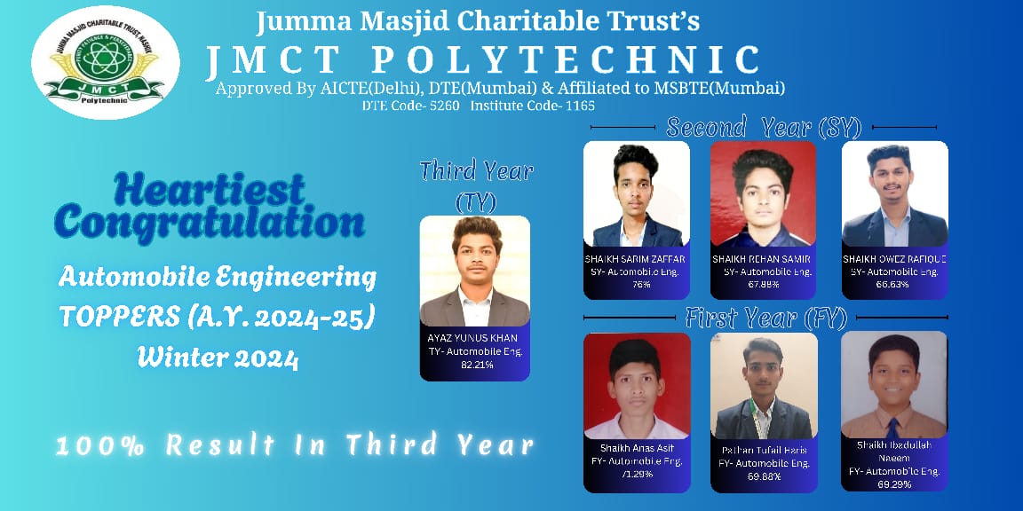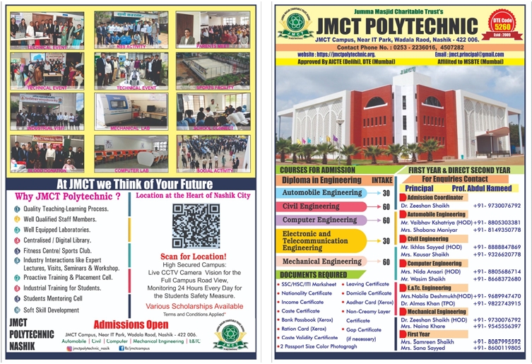 Located in Nasik, Maharashtra, on Wadala Road, Jumma Masjid Charitable Trust operates a premier institution for Diploma in Engineering & Technology education. Since its inception in 2009, the college has garnered prestigious approvals from AICTE (New Delhi), DTE (Mumbai), and affiliation with MSBTE (Mumbai).